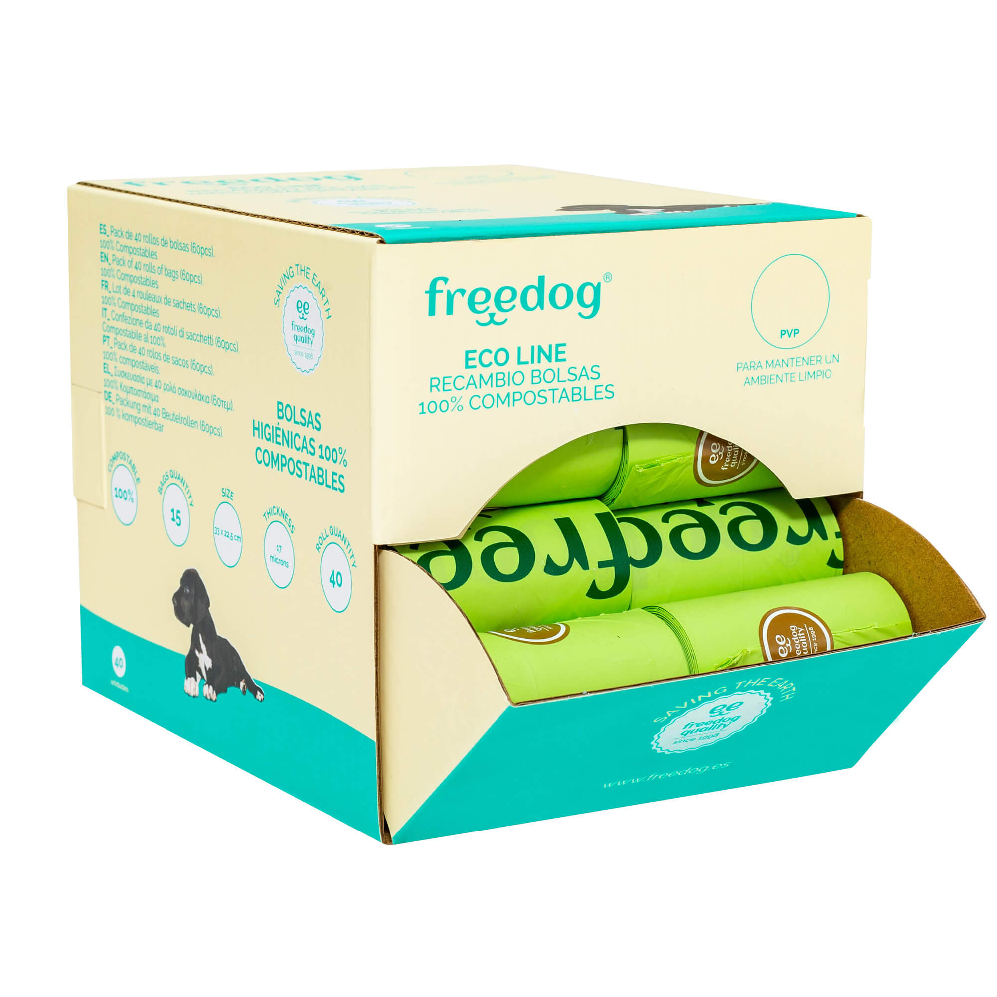 Nadahnute prirodom, ove 100% kompstabilne vrećice dizajnirane su kako bi minimalizirale utjecaj na okoliš. Svaka vrećica je debljine 17 mikrona i ima kartonsku cijev.