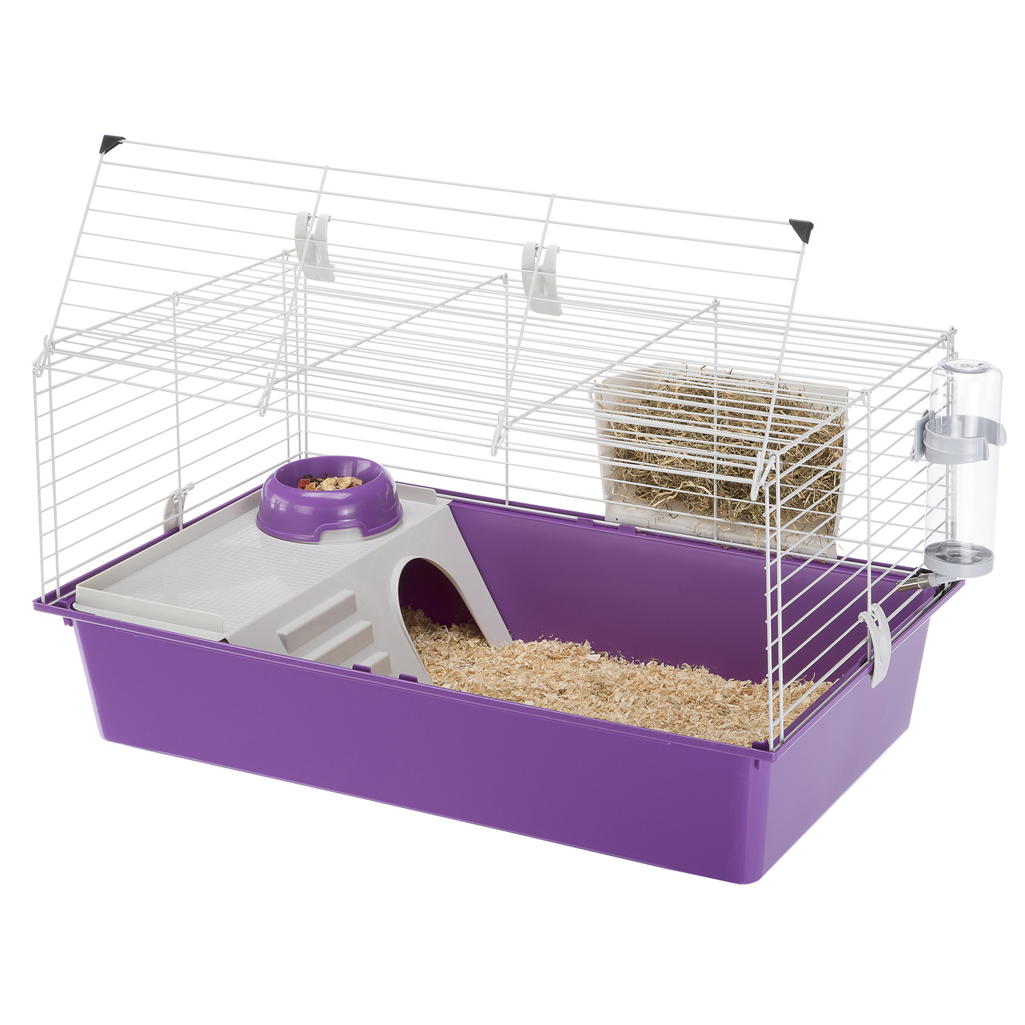 Uključuje pojilicu i plastičnu posudu za sijeno. S odvojivim donjim dijelom za lakše čišćenje. Prednja vrata se mogu potpuno otvoriti.