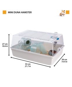 KAVEZ ZA HRČKA MINI DUNA. Kavez od čvrste plastike za hrčke s prozirnim-mrežastim krovom, posebno dizajniranim za ispravnu ventilaciju unutar staništa. Sadrži gnijezdo, hranilicu, ljestve, pojilicu, kotač Korisna rešetka na krovu može se u potpunosti otvariti, omogućujući svakodnevno čišćenje. Baza se također može u potpunosti odvojiti radi lakšeg čišćenja.
