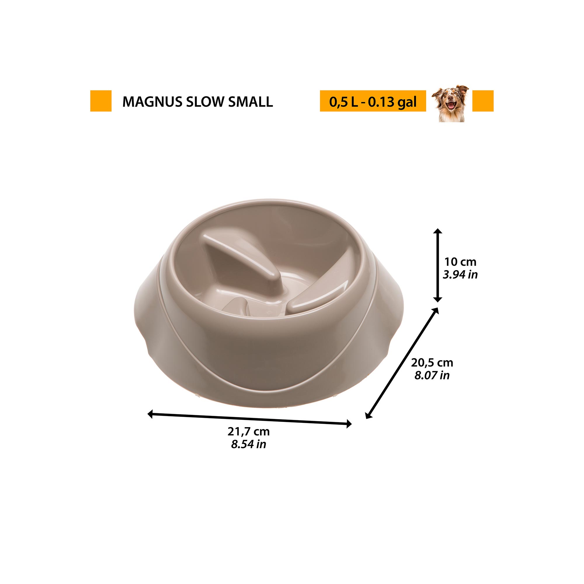 Magnus Slow je zdjelica za pse namijenjena za sporo hranjenje. Unuturnja struktura zdjelica posebno je dizajnirana kako bi usporila konzumaciju hrane na način da “prisili” Vašeg psa da sporije jede i da žvače hranu u manjim zalogajima. Na taj način, pas će puno prije osjetiti sitost, a samim time poboljšat će se i njegova probava, smanjujući nadutost i povraćanje te ograničavajući pretilost.
