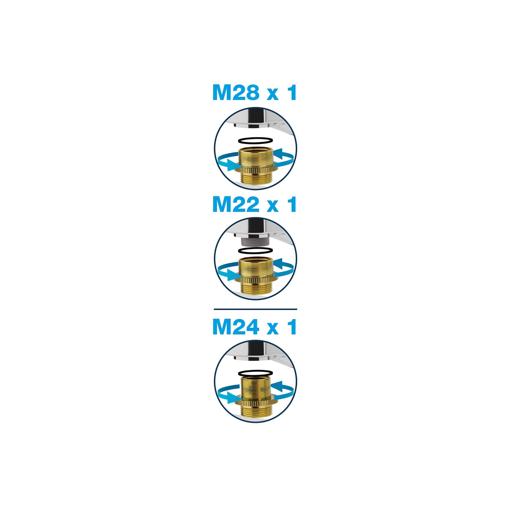 - a) Odvrnite aerator – b) Uvrnite metalni adapter s postojećom brtvom – c) Uvrnite pumpu s vodenim mlazom pomoću priložene brtve – d) Pričvrstite široki kraj crijeva na donji kraj pumpe s vodenim mlazom i izrežite ga tako da završava oko 5 cm iznad odvoda (zaštita od prskanja).