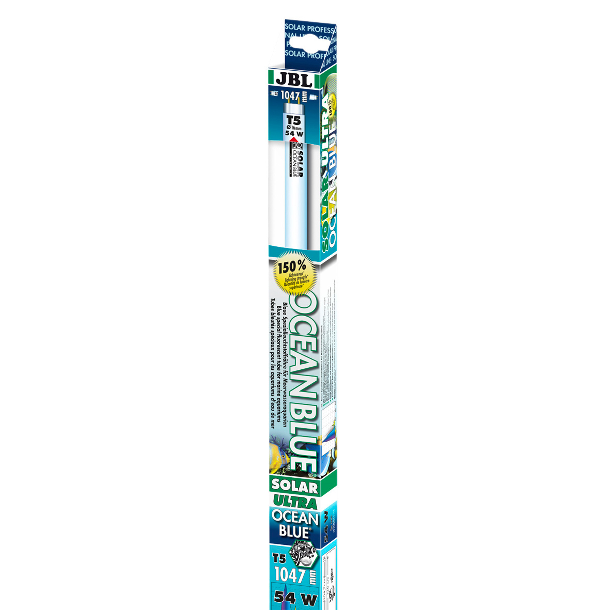 JBL SOLAR OCEAN BLUE ULTRA- specijalna aktinska frourescentna T5 rasvjeta standa- rdnih i specijalnih duljina. Potiče rast koralja povećanjem plavog dijela spektra (tzv. aktinski spektar) poželjnog za fotosintetske alge.Naglašava intenzivnu plavu boju i sadrži aktinski spektar. Ističe predivan flourescentni efekt koralja. 150% količine svjetla u usporedbi s klasičnim flourescentnim tubama istog spektra. Dugovječnost i pouzdanost postignuti su posebnim premazom, volframovim elektrodama i punjenjem inertnim plinom.Flourescentni učinak vidljiv je kada je dnevna rasvjeta ugašena. Pogodne kao osvjetljenje sumraka za slatkovodne akvarije. Duljina i snaga otisnuti na pakiranju.
