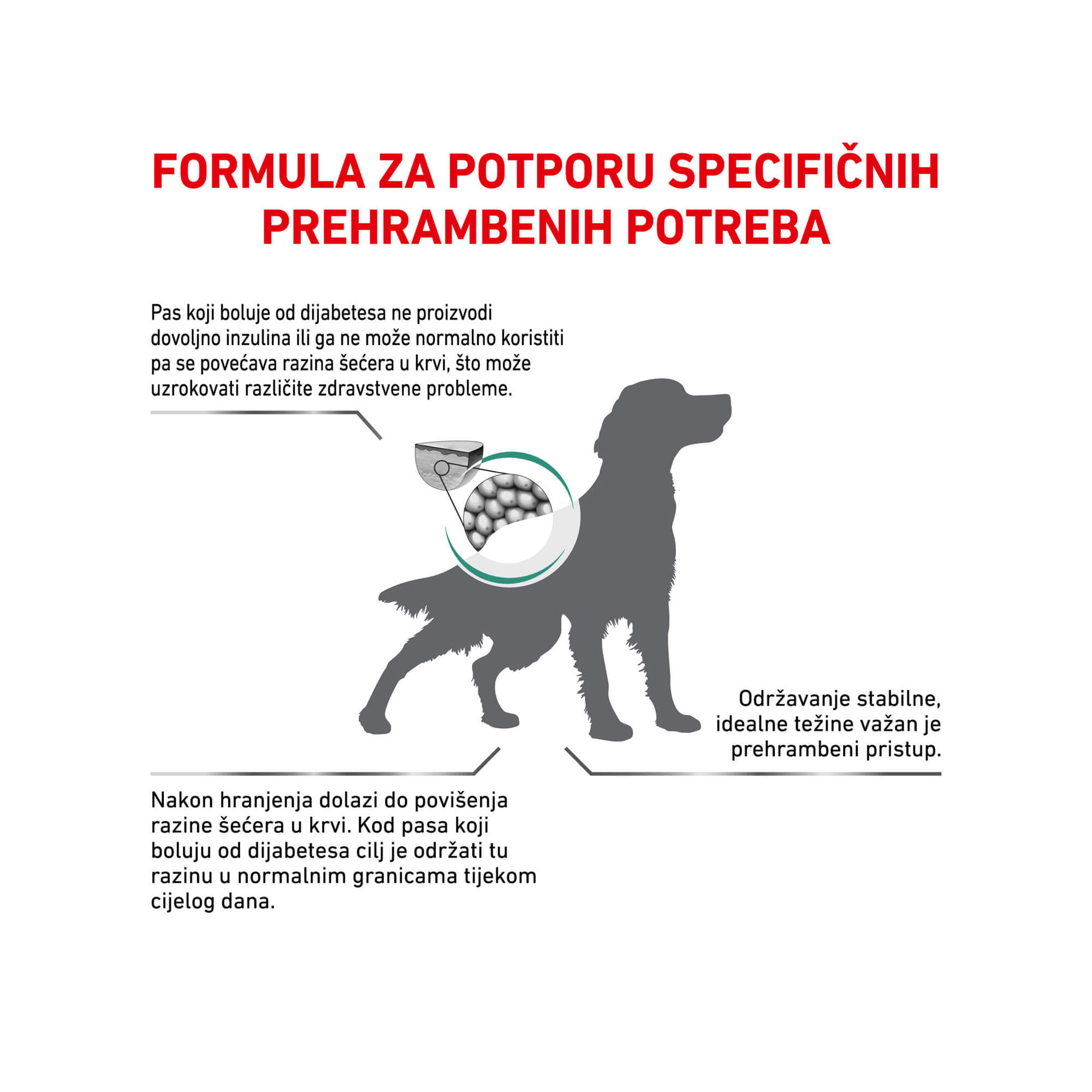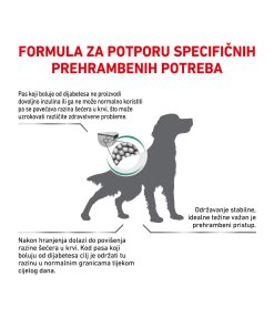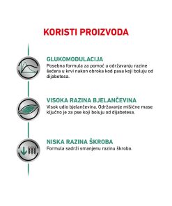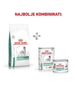 ROYAL CANIN® DIABETIC suha hrana je potpuna dijetetska hrana za pse formulirana za regulaciju opskrbe glukozom (Diabetes mellitus). Niska razina monosaharida i disaharida.