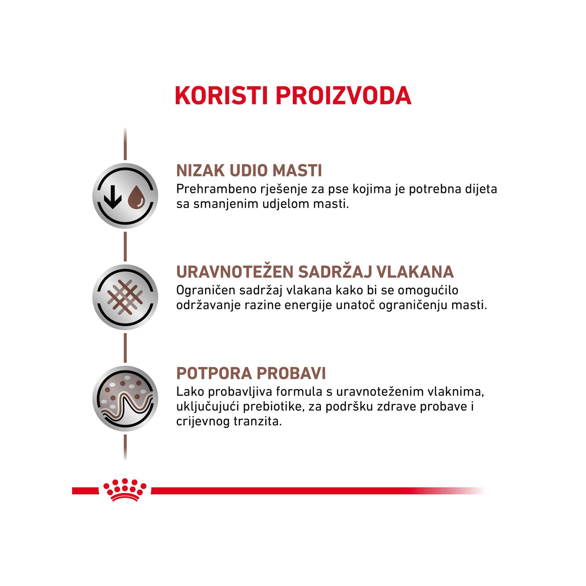 Potpuna suha dijetetska hrana za odrasle pse, formulirana za potporu metabolizma lipida u slučajevima hiperlipidemije. Ova dijetetska hrana sadrži nisku razinu masti, ali visoku razinu esencijalnih masnih kiselina.